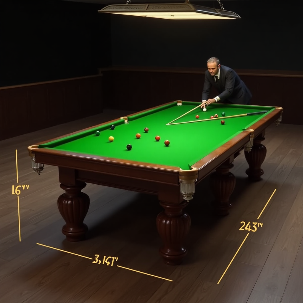 Snooker tables come in different sizes, but the standard tournament size is 12ft x 6ft (365.8 cm x 182.9 cm).